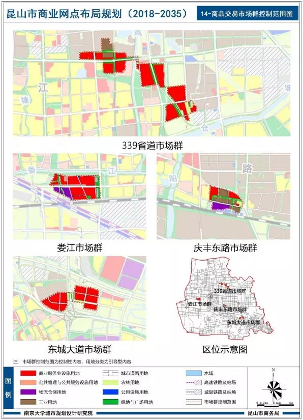 规划异地搬迁市场网点共计7处,昆山二手挖掘机交易市场、华贸国际汽车商城、港龙建材批发市场建议迁至339省道市场群;苏沪边界废旧物资交易市场和超华商贸城建议迁至娄江市场群; 花桥国际美车城-建材家居广场、添乐福美居机电建材城建议迁至庆丰东路市场群。
