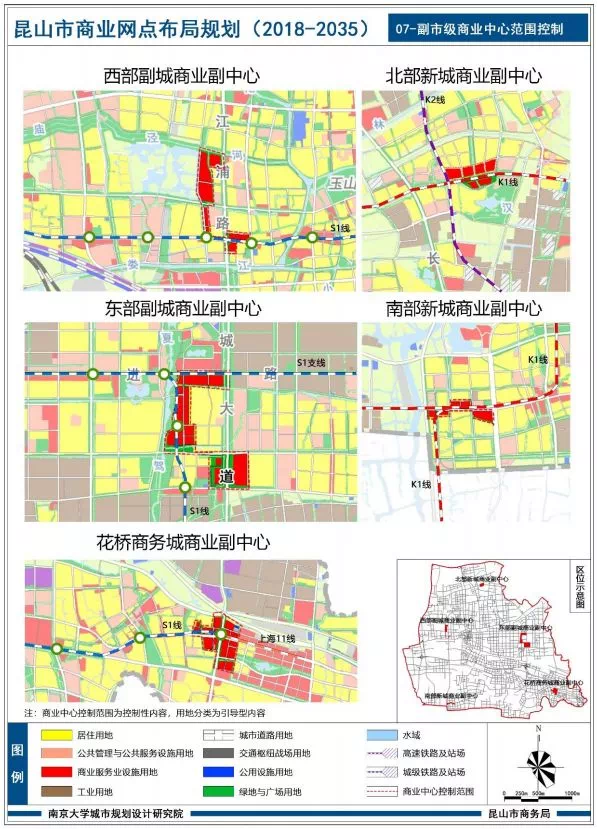 规划昆山南站商业中心区作为全市核心的交通枢纽商业中心区,充分发挥昆 山南站商务出行优势,打造集商务办公、商业服务、休闲娱乐、文化会展为一体的高档次、多功能的商业中心区,提升昆山的门户形象。